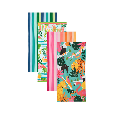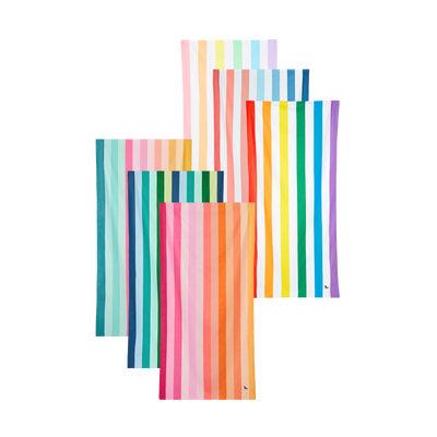 Quick-dry beach towels made from DryQ™ fabric that dries 3x faster than cotton and repels sand effortlessly. Available in over 40 vibrant designs and three sizes (Medium, Large, Extra Large), each towel packs incredibly small into its pouch. Made from 100% recycled materials. Perfect for beach holidays, pool days, and outdoor adventures.