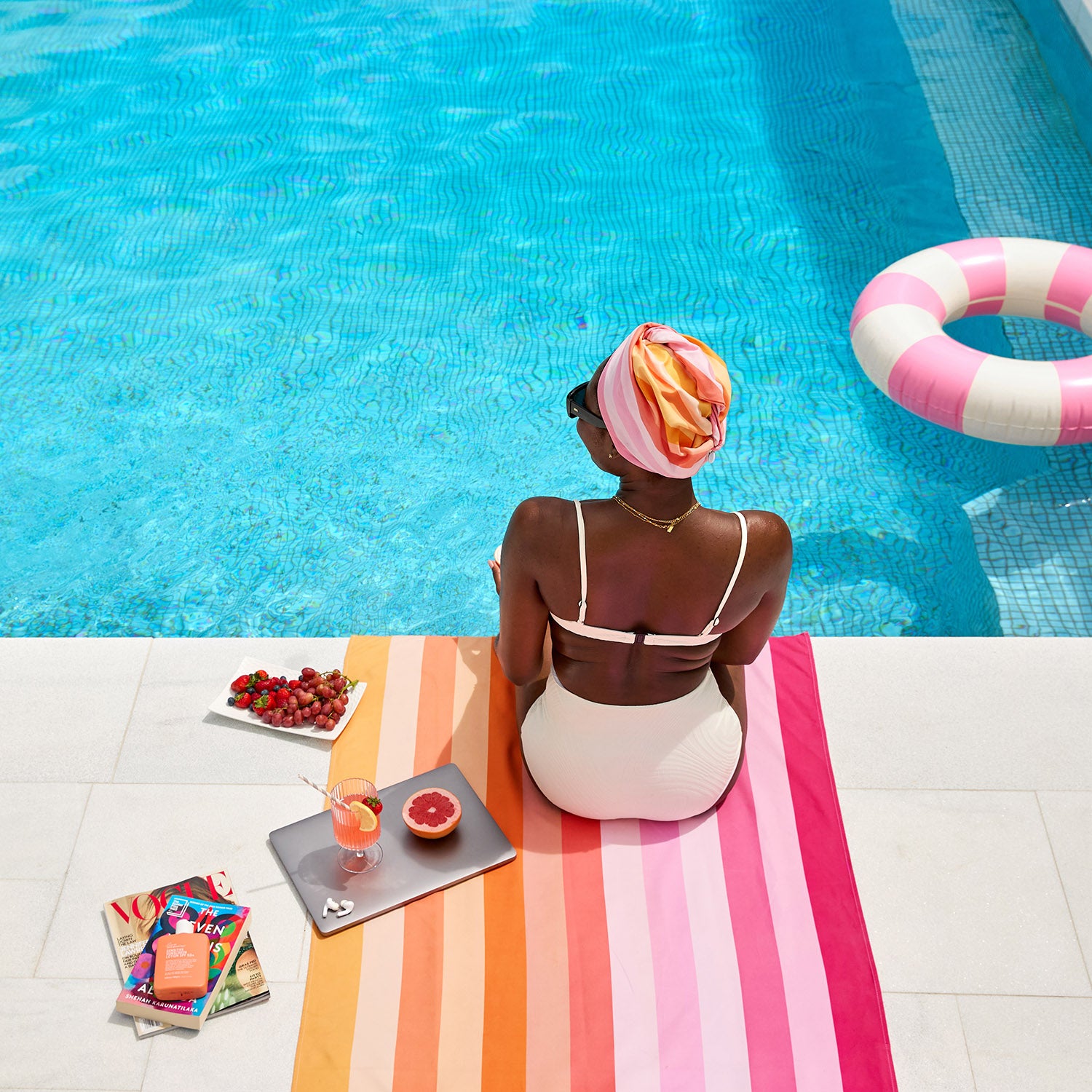 The Hair Towel designed to dry your hair faster, more gently, and with less fuss. Perfect for post shower routines and travel, it helps cut down drying time without the heat damage of a hairdryer.