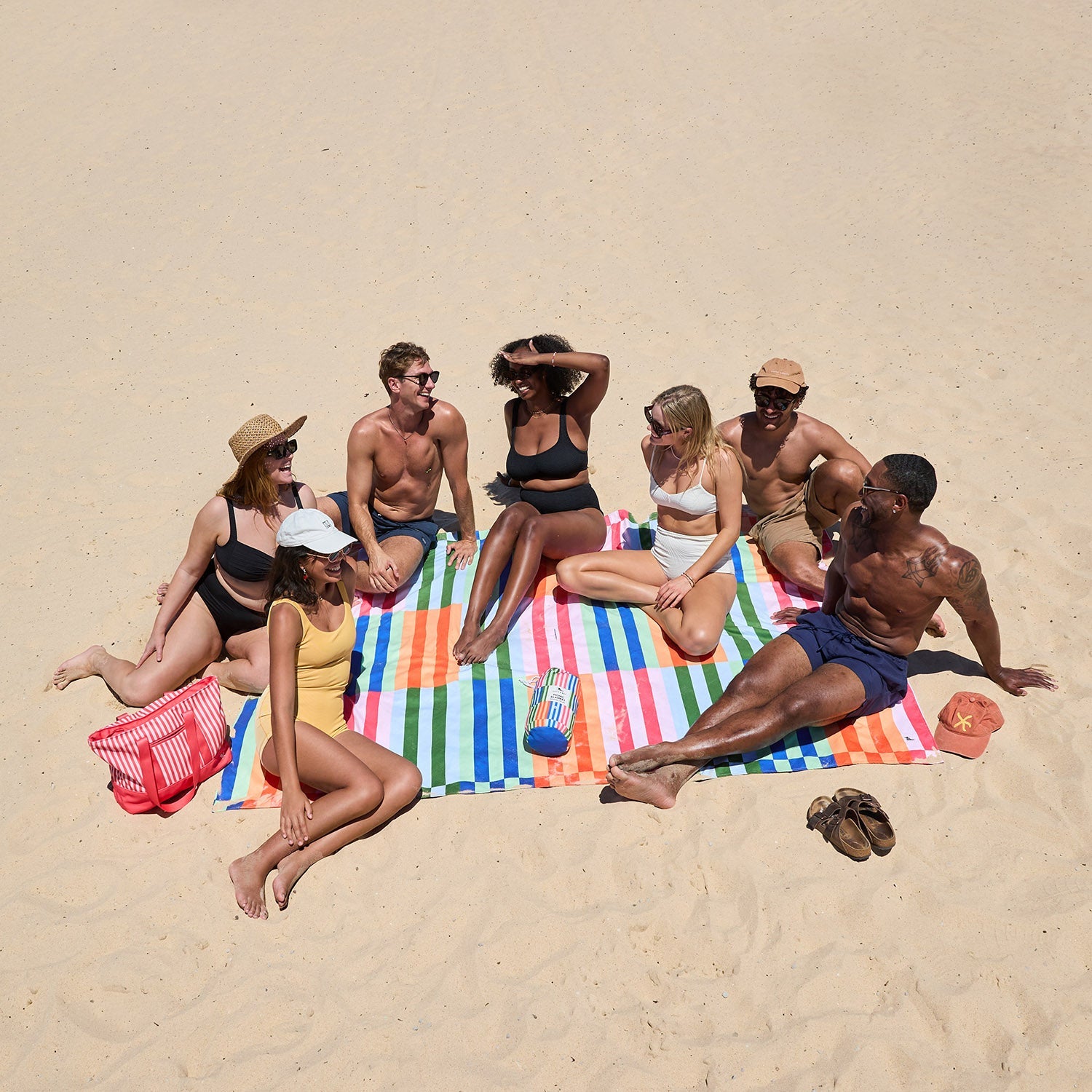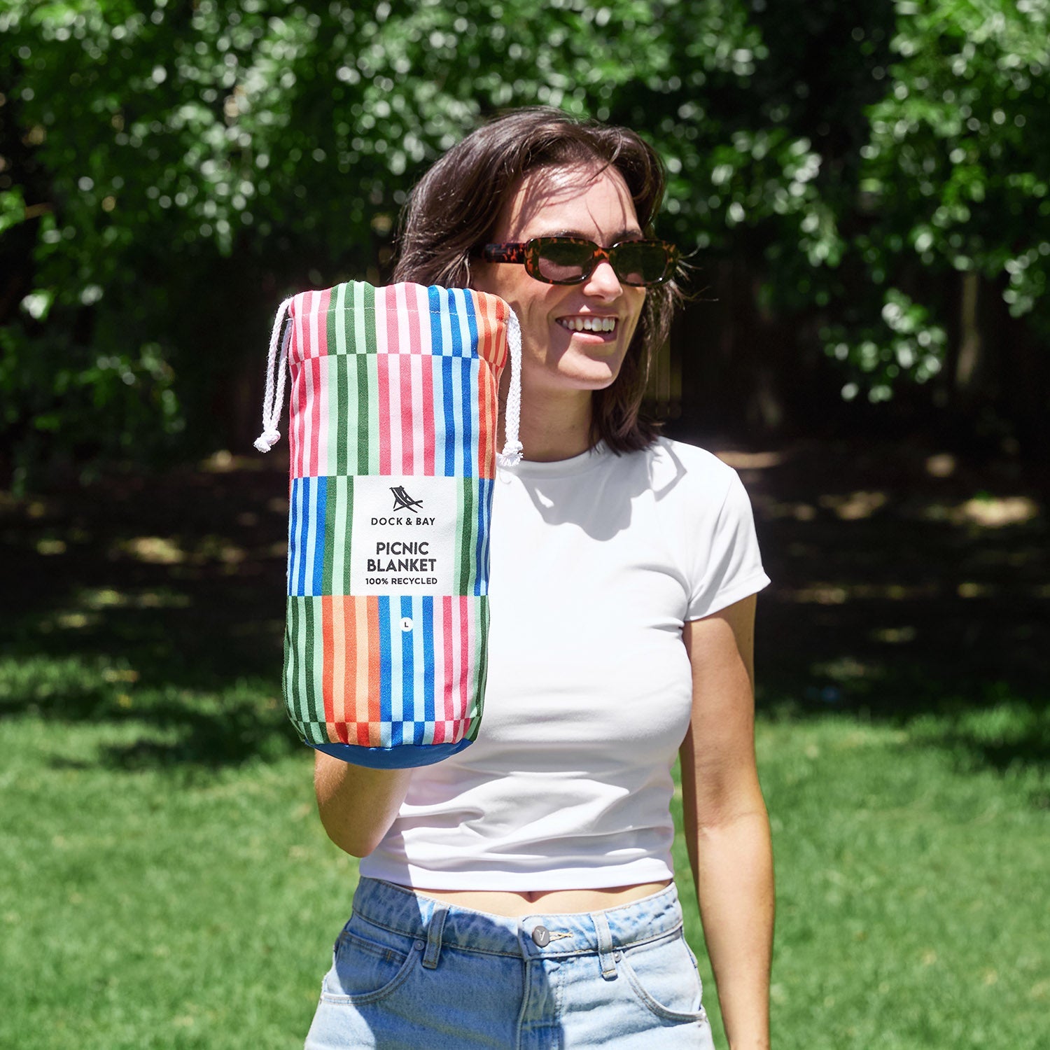 Made from 100% recycled materials and finished with a water resistant backing, it’s designed to handle grass, sand, and damp ground with ease. Soft towel material (DryQ™ fabric) on top for sitting or lounging, tough underneath for real outdoor use. When you’re done, it folds down neatly into its carry pouch, ready for the next adventure.