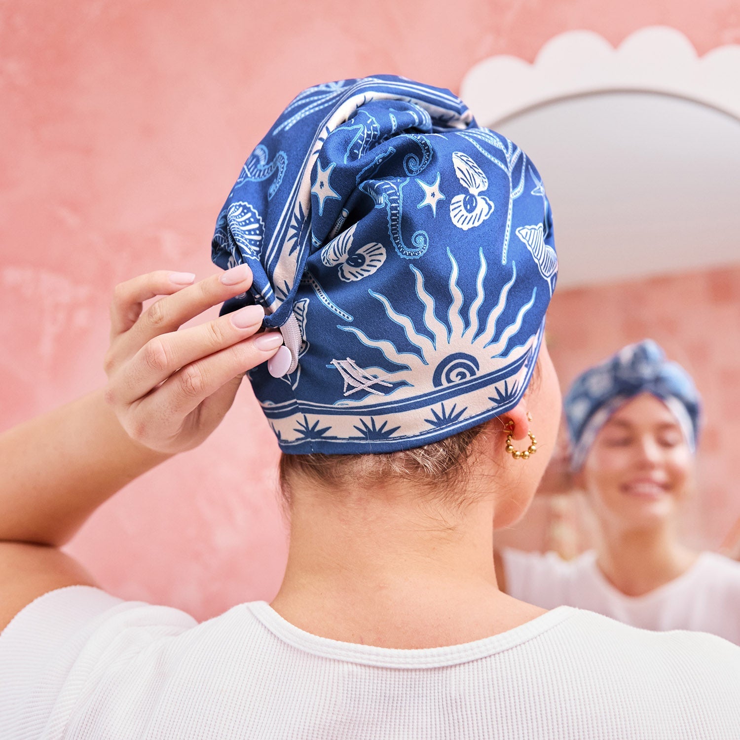 Made from our premium recycled DryQ™ fabric, it’s lightweight (no more neck pain), super absorbent, and soft on hair. The wrap and button design keeps it securely in place, so you can get on with your routine while it works its magic. Loopless fabric creates less rubbing, less frizz, and happier hair all round.